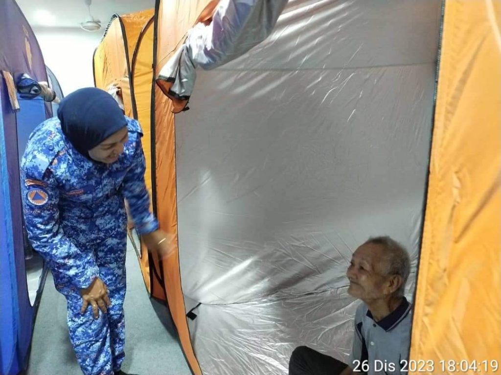 Anggota APM meninjau keadaan mangsa banjir yang dipindahkan di Masjid Nur Iman, Kampung Sungai Memanjang, Sandakan. – Foto/APM