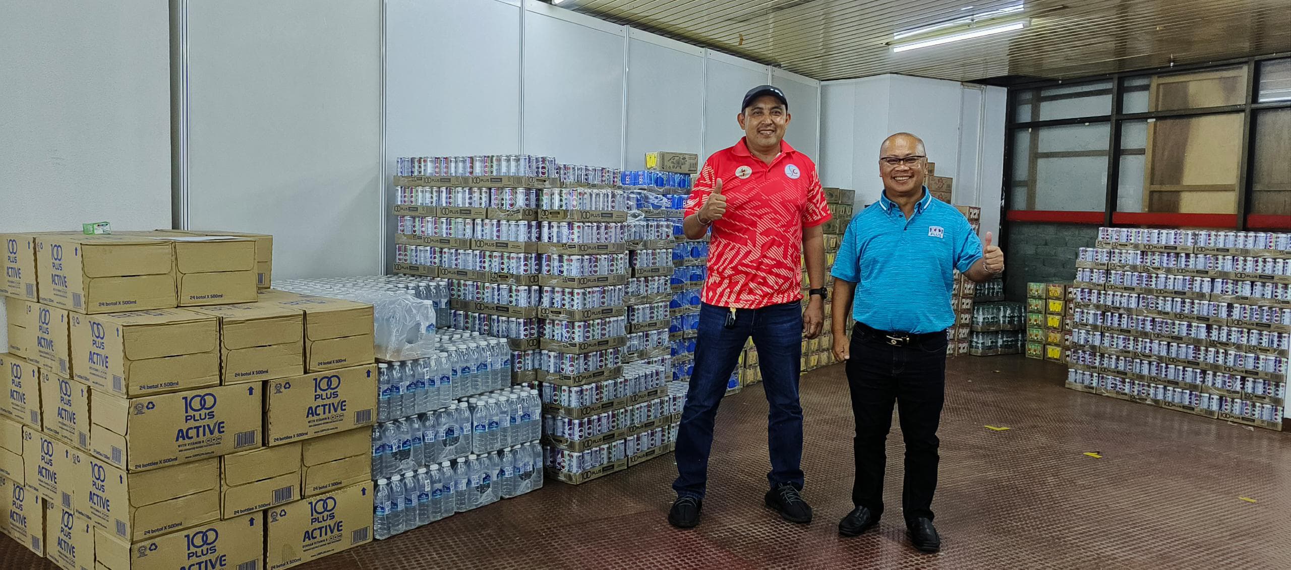 PENGARAH Majlis Sukan Negeri Sabah, Mohd Asneh Mohd Noor (Kiri) bersama Pengurus Perhubungan Kerajaan dan Korporat (Malaysia Timur dan Brunei) F&N Beverages Marketing Sdn Bhd, Valerian Hansen Petrus semasa menerima tajaan minuman 100Plus dan Seasons di Urusetia Sukan Sabah (SAGA) X Kota Kinabalu 2023 di Wisma MUIS, Sembulan, Kota Kinabalu, hari ini.