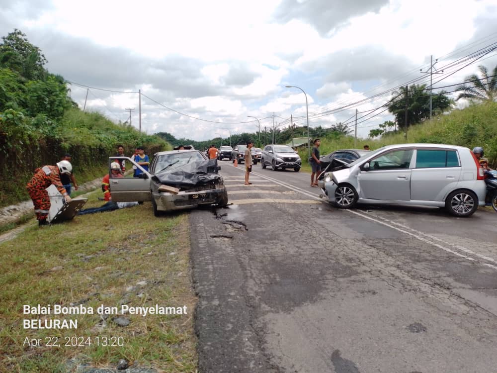 BELURAN: Enam termasuk tiga kanak-kanak cedera dalam kemalangan dua kenderaan di Simpang Muanad 3, di sini, hari ini.