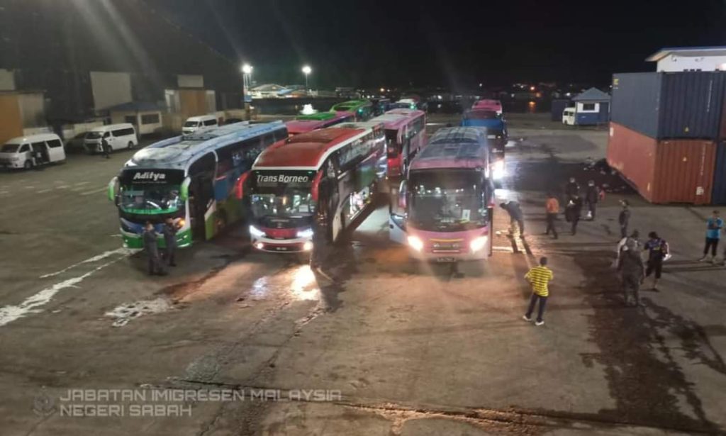Tahanan Depot Imigresen Kota Kinabalu dan Papar dihantar ke Pelabuhan Sandakan menaiki bas ekspres. – Foto JIM