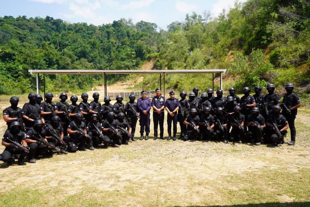 Aksi pegawai dan anggota D9 ketika melakukan demonstrasi menumpaskan penyeludupan senjata api. – Foto/PDRM