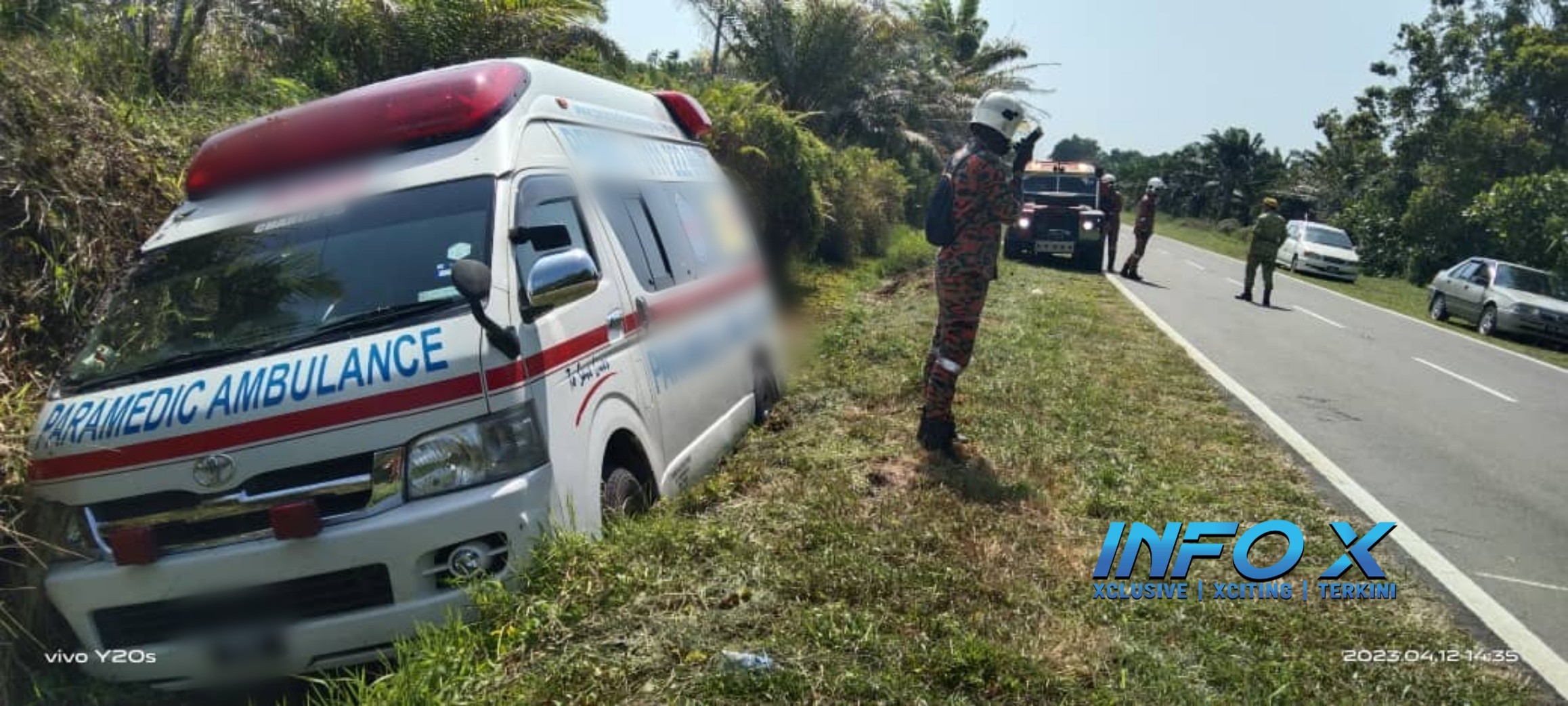 KUALA PENYU: Sebuah ambulans swasta yang membawa pesakit dilaporkan terbabas dalam parit di Jalan Kuala Penyu, Kampung Binsulok, di sini, hari ini.