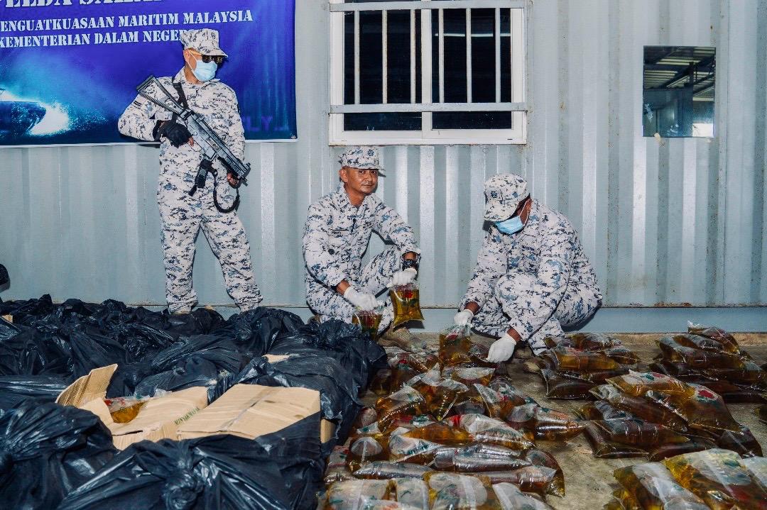 Anggota APMM memeriksa minyak masak bersubsidi yang dirampas dalam operasi berimpak tinggi di perairan Tanjung Batu, Lahad Datu. – Foto/APMM