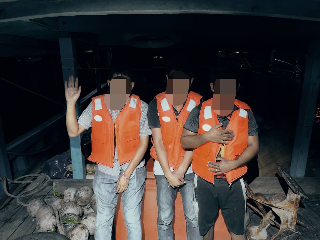 Tekong dan dua awak-awak bot kargo yang ditahan APMM di perairan Kudat. – Foto/APMM
