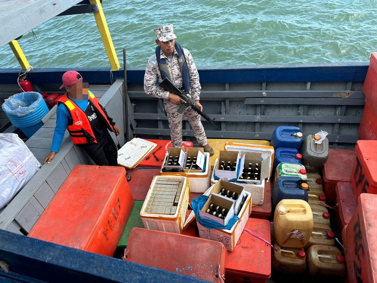 “Turut ditemui 72 botol minuman keras pelbagai jenama dan 33 karton rokok tidak bercukai yang dibawa oleh seorang juragan berusia 32 tahun.