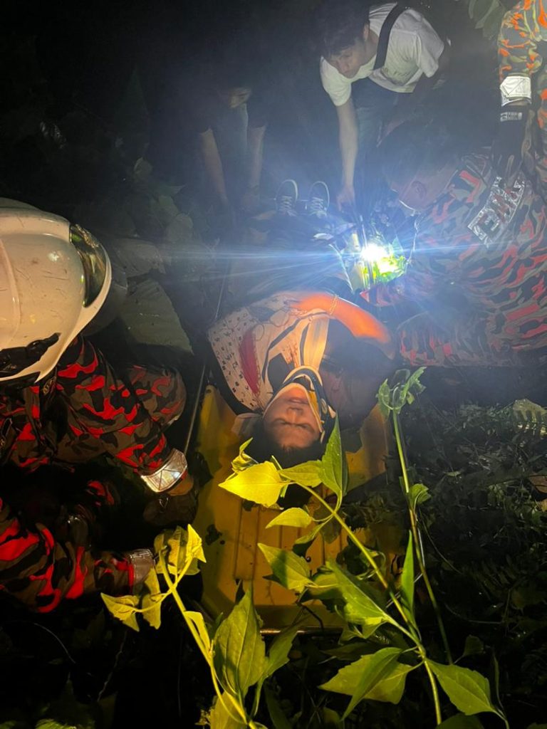 Pasukan bomba membawa keluar penumpang yang cedera selepas bas ekspres terbabas lalu jatuh ke gaung di Batu 9, Jalan Silam, Lahad Datu. – Bomba