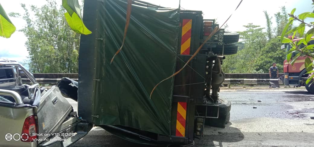 Kemalangan di Jalan Tamparuli – Ranau itu membabitkan lori Isuzu milik PDRM, Isuzu D-Max dan Perodua Bezza.