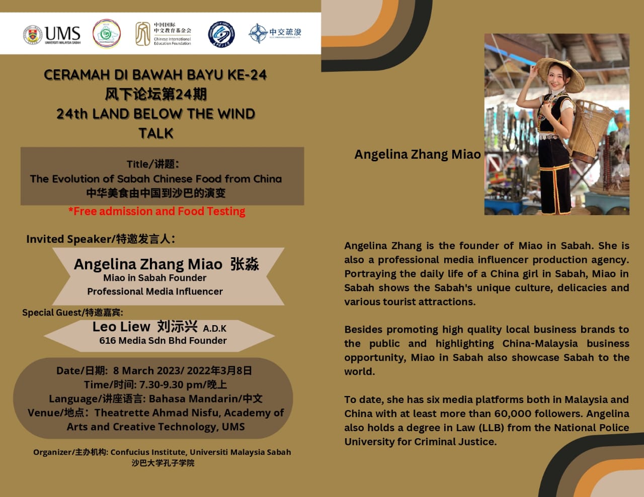 KOTA KINABALU: Confucius Institute, Universiti Malaysia Sabah (CI@UMS) meneruskan siri Ceramah Di Bawah Bayu kali ke-24 dengan mengetengahkan topik ceramah bertajuk ‘Evolusi masakan Cina Sabah dari China’ yang akan berlangsung pada 8 Mac ini.