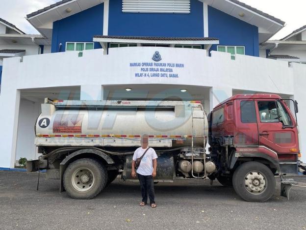 LAHAD DATU: Cubaan menyeleweng kira-kira 10,000 liter minyak diesel gagal apabila Pasukan Polis Marin (PPM) Wilayah 4 Sabah menahan seorang lelaki dalam Op Tiris di Jalan Paris 3, di sini, hari ini.