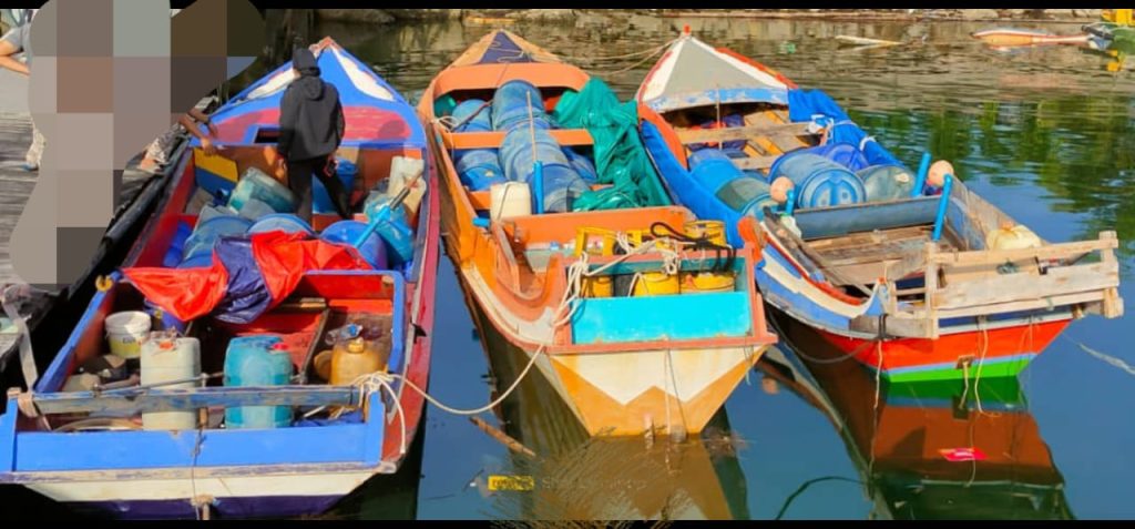 Tiga bot pam bawa muatan 44 tong dram berisi petrol dirampas APMM di perairan Pitas. – Foto/APMM