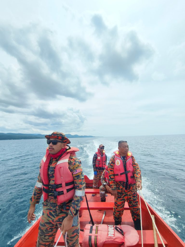 Pasukan bomba melaksanakan pencarian di sekitar pesisir pantai Bakapit, Lahad Datu. – Foto/Bomba