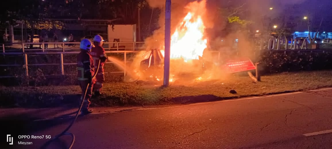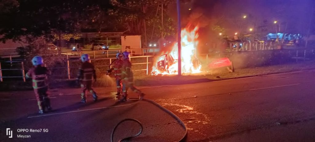 “Kebakaran membabitkan sebuah motosikal dan Perodua Myvi. Kedua-dua terbakar sepenuhnya akibat daripada kemalangan jalan raya.