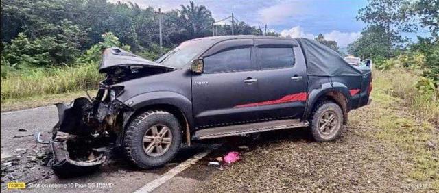 BELURAN: Dua sahabat maut apabila kereta yang dinaiki bertembung sebuah kenderaan pacuan empat roda dalam kejadian di Jalan Telupid/Tongod, di sini, semalam.