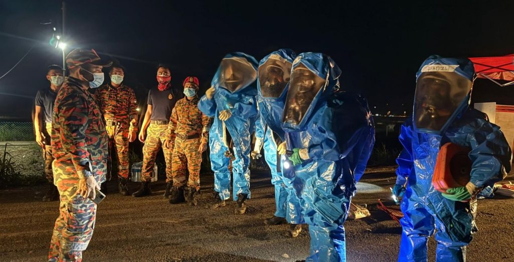 Pasukan bomba menggunakan pakaian perlindungan HAZMAT untuk menjalankan operasi di lokasi kejadian. – Foto/Bomba