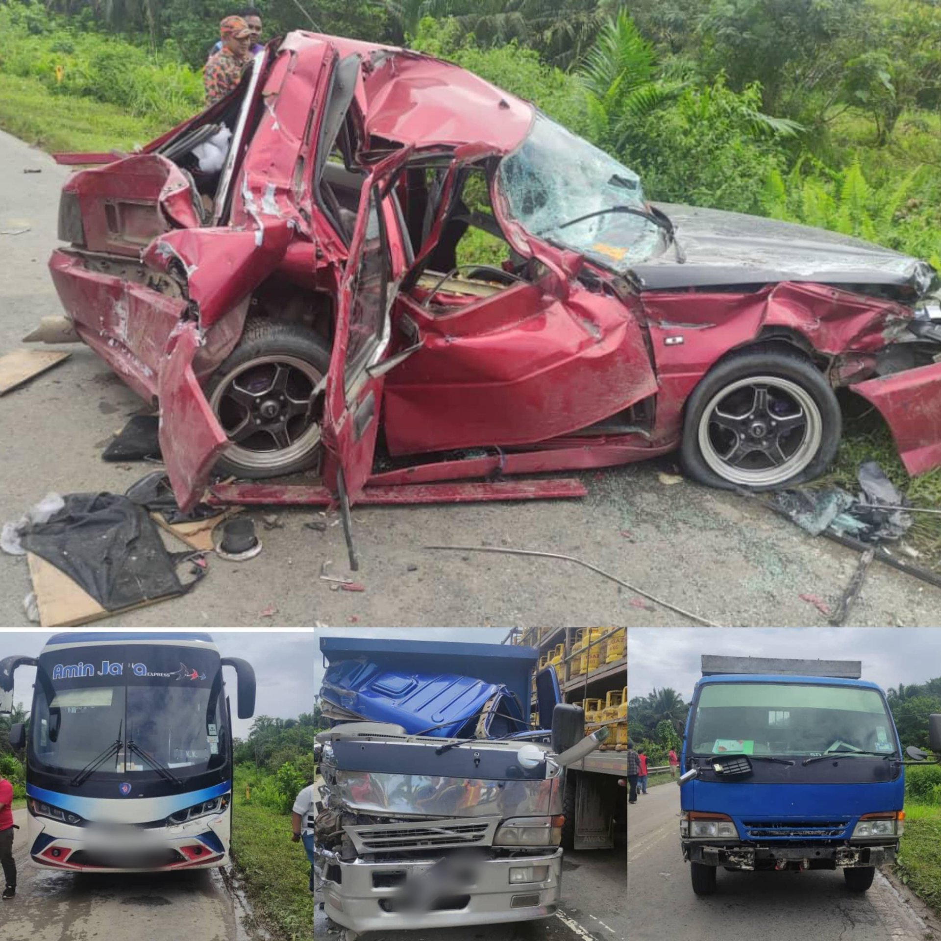 Kemalangan itu membabitkan bas ekspres, Proton Iswara Aeroback dan tiga lori jenis tiga dan 10 tan.