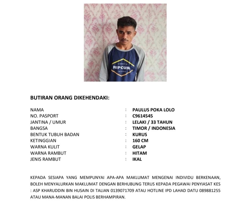 “Polis sedang giat mengesan suspek iaitu seorang lelaki warga asing yang dikenali sebagai Paulus Poka Lolo berusia 33 tahun dan bekerja sebagai Pekerja Am di ladang kelapa sawit berkenaan,” katanya dalam kenyataan media, hari ini.
