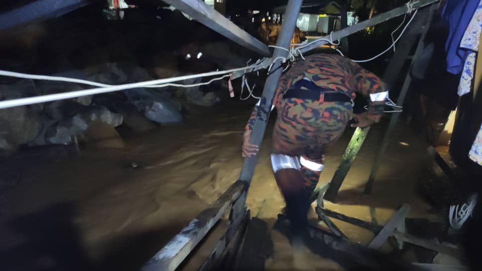 Pasukan bomba melakukan operasi SAR di lokasi mangsa dilaporkan terjatuh ke dalam sungai di Kampung Kurnia Jaya, Jalan Apas Batu 4, Tawau. – Foto/Bomba