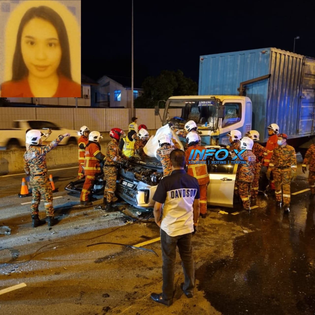 Mangsa Nicolette Hannah George, 26, yang memandu kereta Perodua Bezza disahkan meninggal dunia di tempat kejadian.