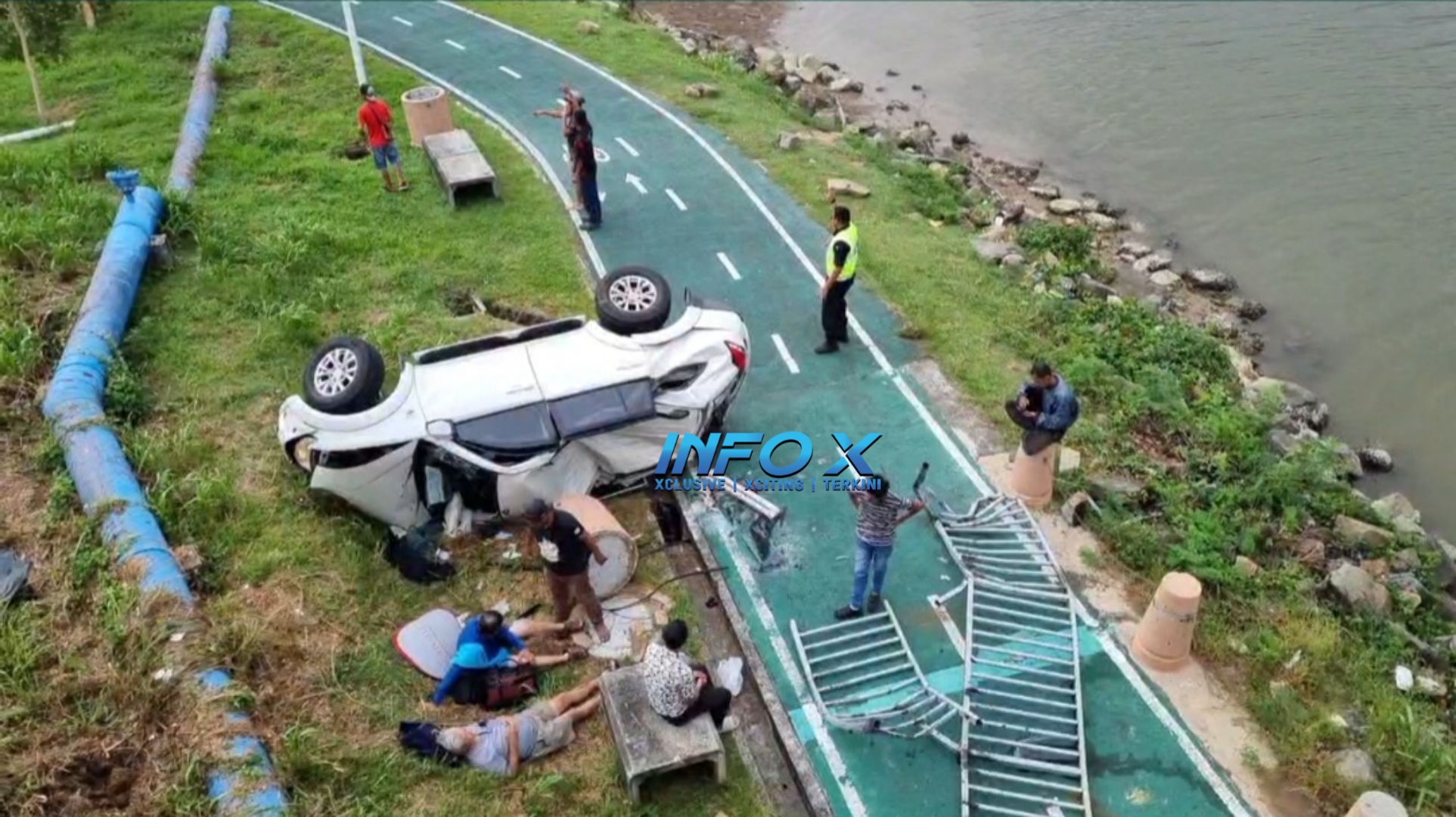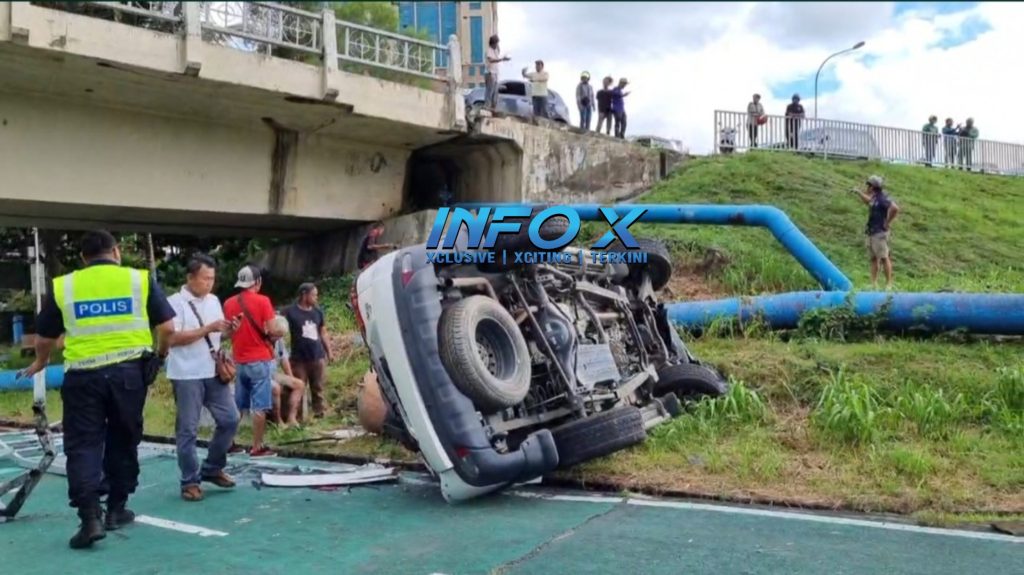 KOTA KINABALU: Tiga rakan berdepan detik cemas apabila kenderaan dinaiki mereka terjatuh ke laluan jogging Pusat Rekreasi Teluk Likas, di Jambatan Yayasan Sabah, di sini, hari ini.