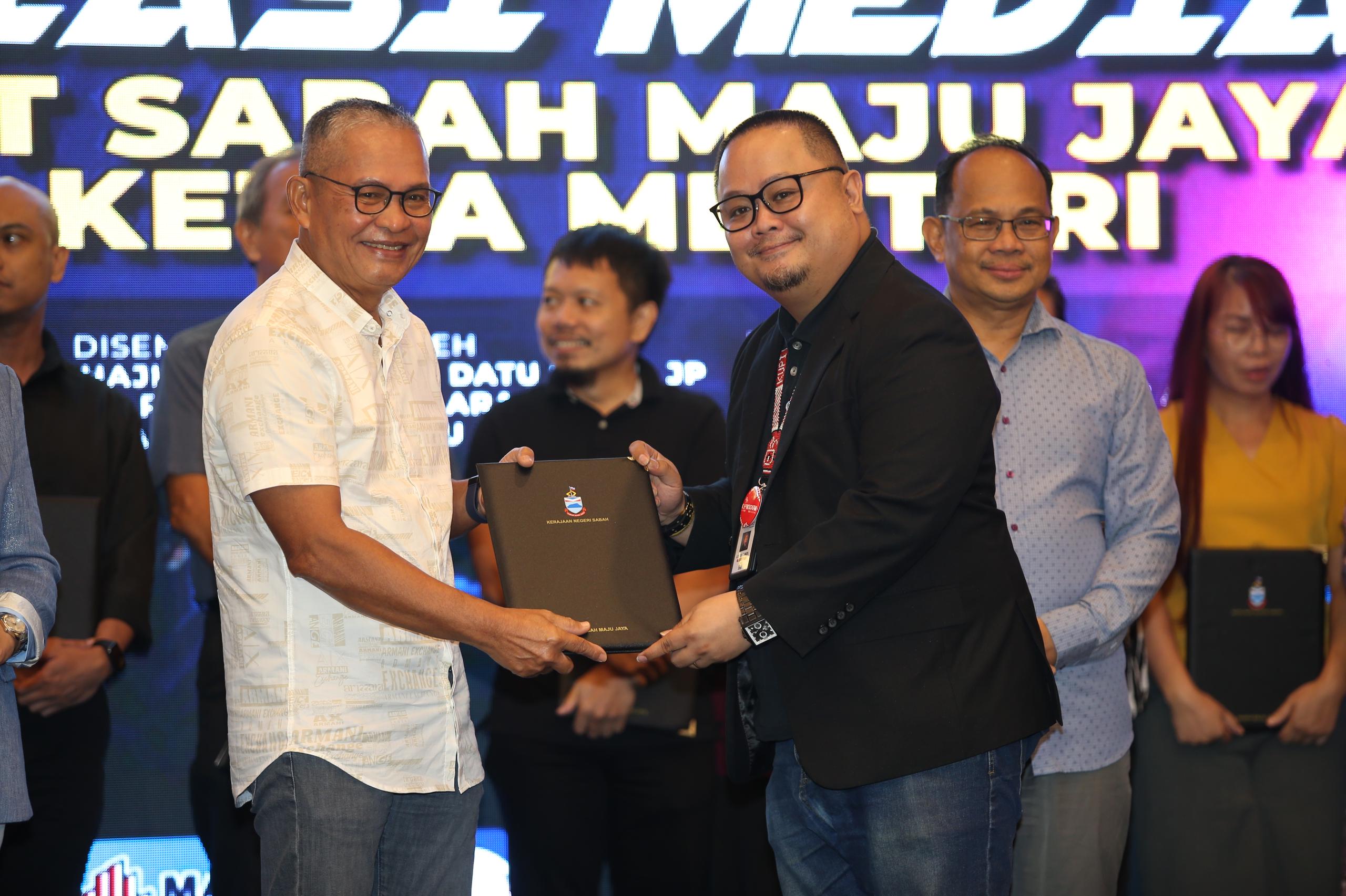 Penghargaan yang disampaikan Ketua Penyelaras Sekretariat Sabah Maju Jaya (SMJ), Datuk Datu Rosmadi Datu Sulai itu diterima Pengurus Besar Kupi-Kupi FM, Lester Calvin Miol.