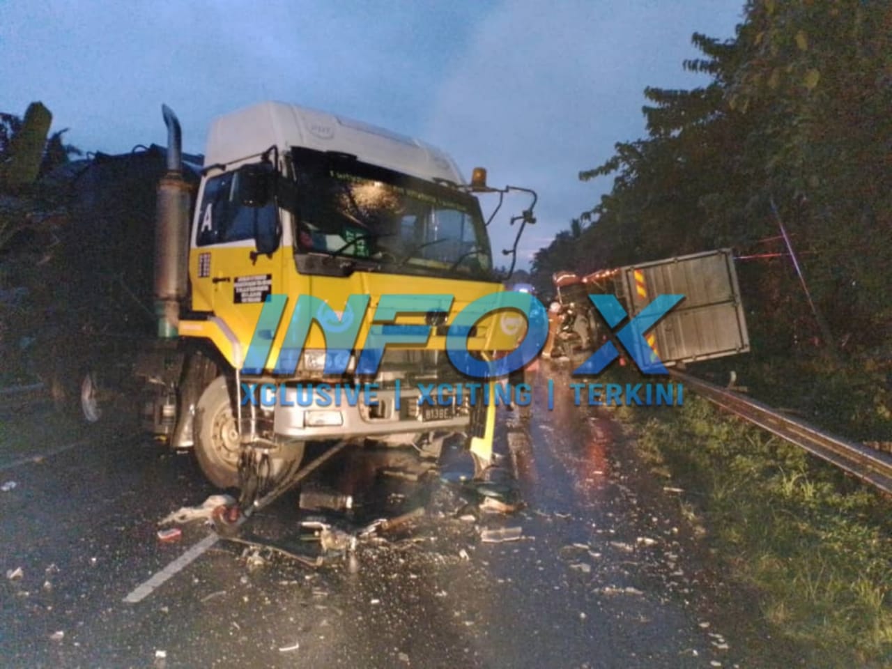 LAHAD DATU: Seorang kelindan lori tiga tan maut selepas kenderaan dinaikinya bertembung dengan sebuah lagi lori tangki dalam kejadian di Jalan Segama, di sini, awal pagi tadi.