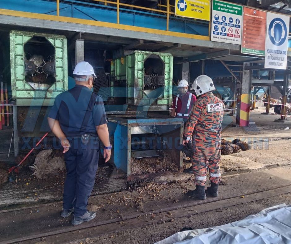 BELURAN: Seorang pekerja kilang maut selepas dipercayai tersepit dalam mesin pengisar ‘conveyer’ sawit di sebuah kilang minyak kelapa sawit, di sini, awal pagi tadi.