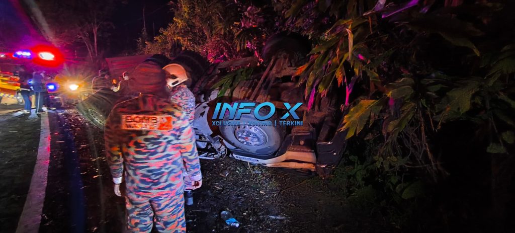TAMPARULI: Seorang lelaki maut apabila treler dipandunya terbabas sebelum melanggar tebing bukit di Jalan Tamparuli, Kampung Kelawat, di sini, malam ini.