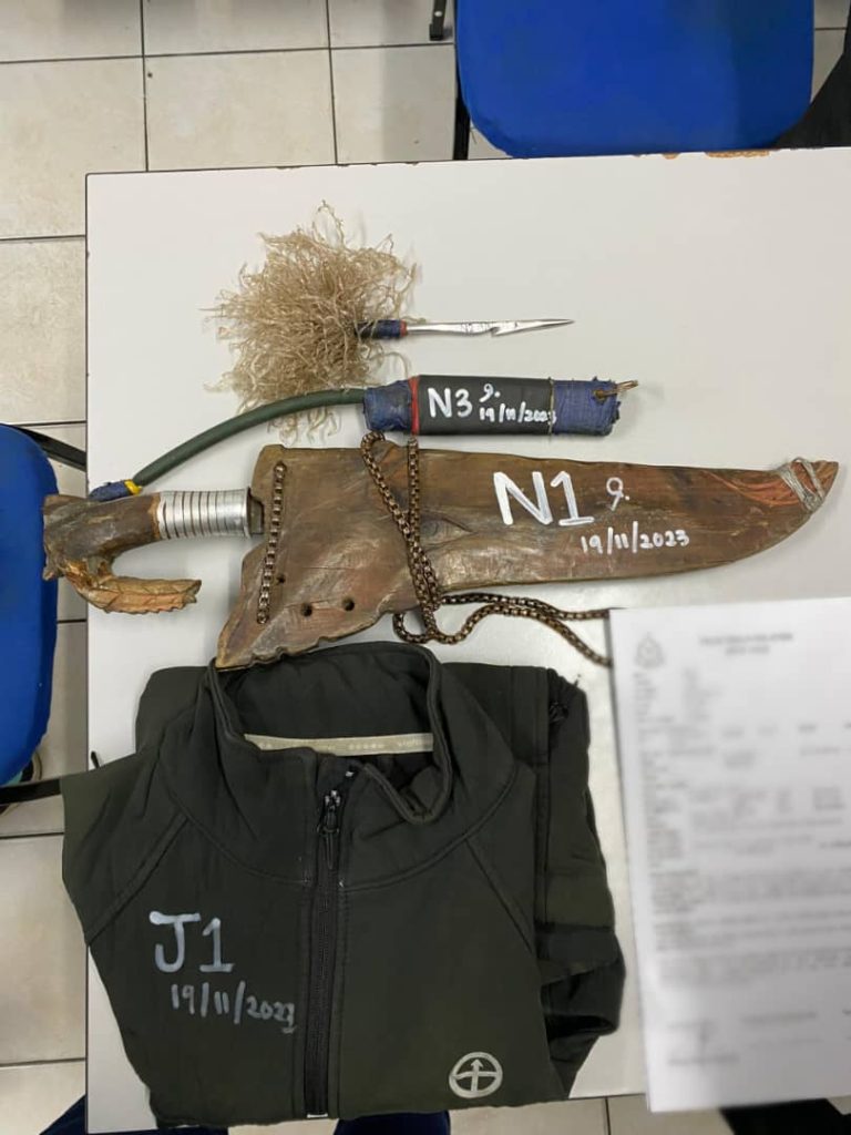 Katanya, hasil pemeriksaan lanjut ke atas kereta berkenaan menemukan sebilah parang di bawah kerusi pemandu dan sebatang anak panah lastik (Flying Feather) bersama lastik.