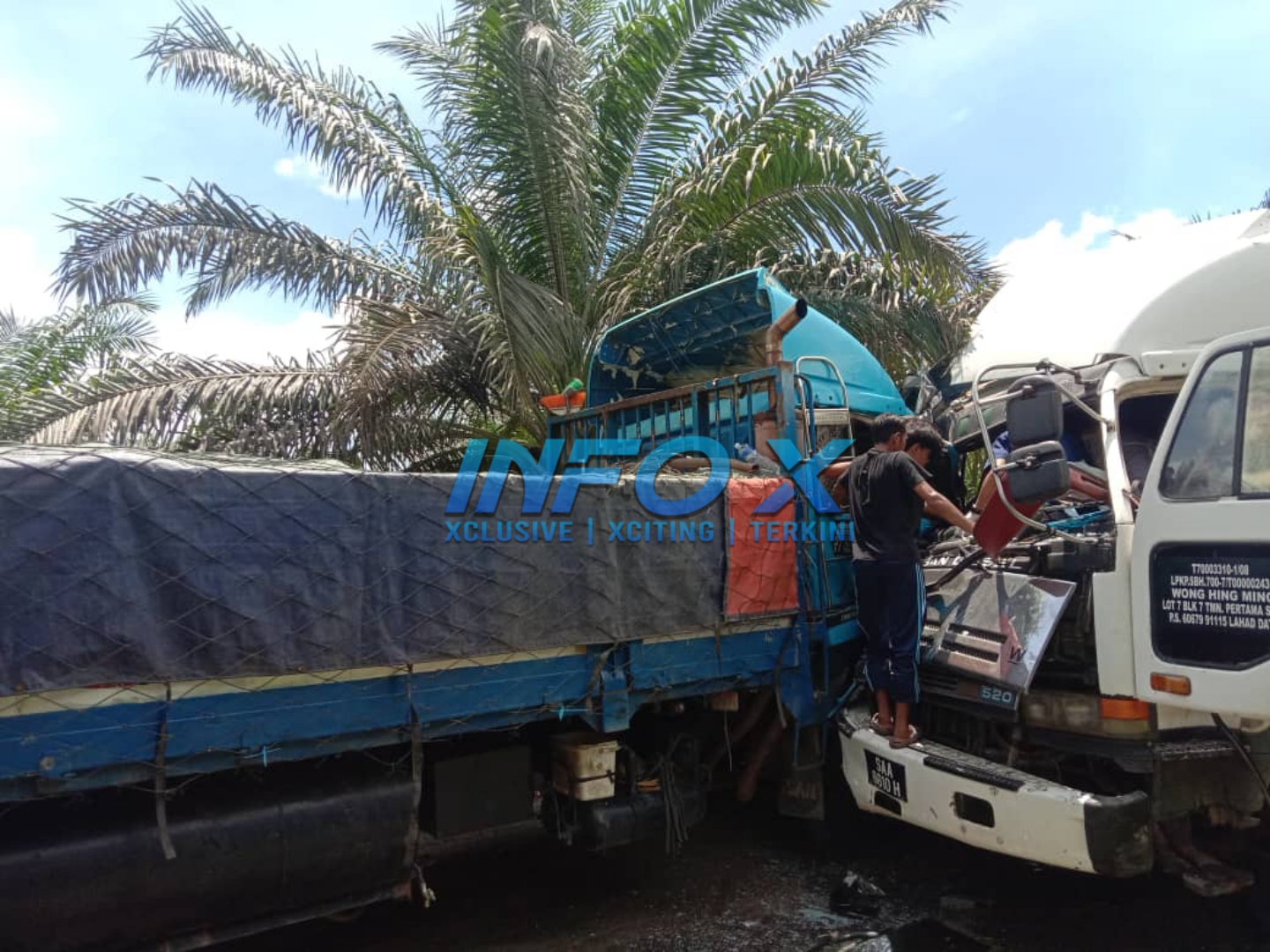 “Kemalangan membabitkan dua lori 10 tan yang membawa muatan sawit bertembung sesama sendiri selepas dipercayai hilang kawalan dan terdapat dua mangsa tersepit.