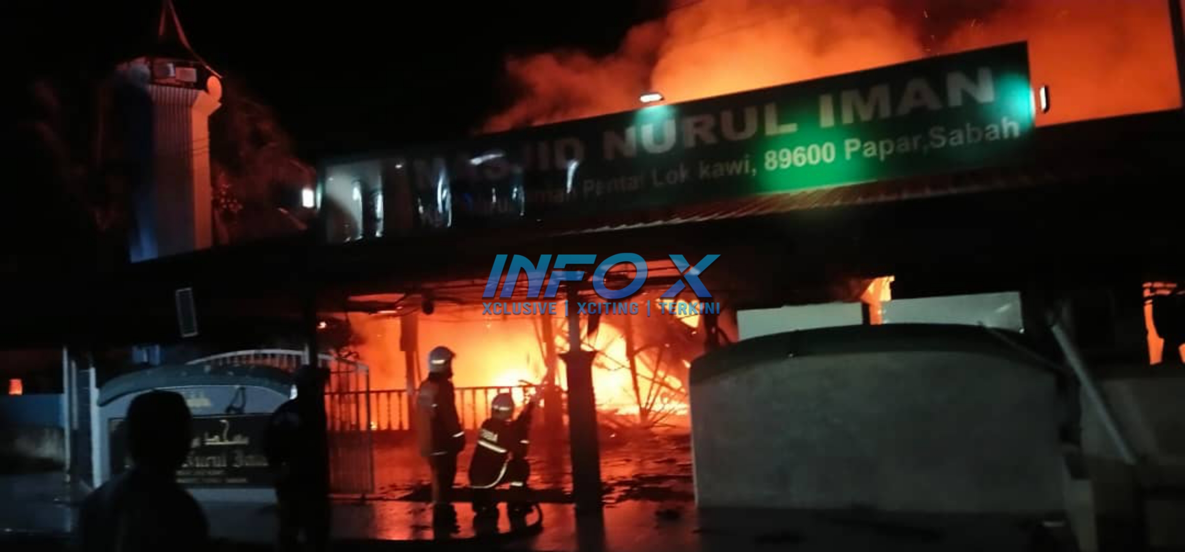 PAPAR: Masjid Nurul Iman Sabindo, berhampiran Taman Pantai Lok Kawi, di sini, dilaporkan musnah terbakar, awal pagi tadi.