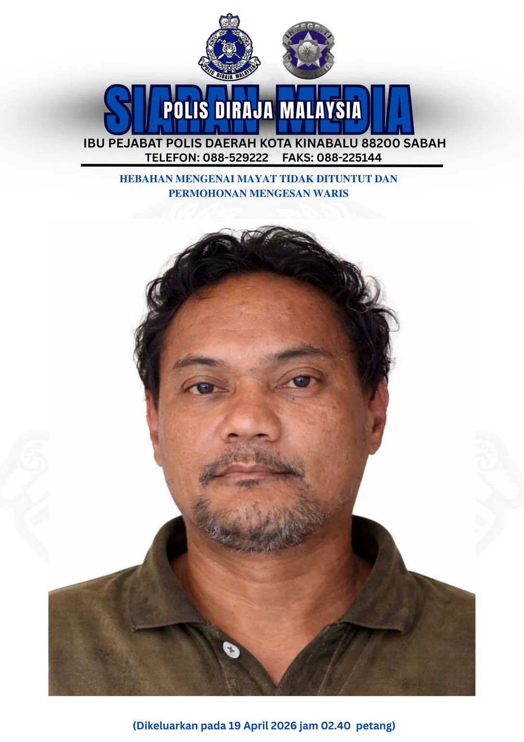 KOTA KINABALU: Polis memohon kerjasama orang ramai bagi mengesan waris seorang lelaki yang ditemui meninggal dunia di hadapan sebuah premis di Jalan Jati berhampiran kawasan Jalan Gaya, di sini, semalam.