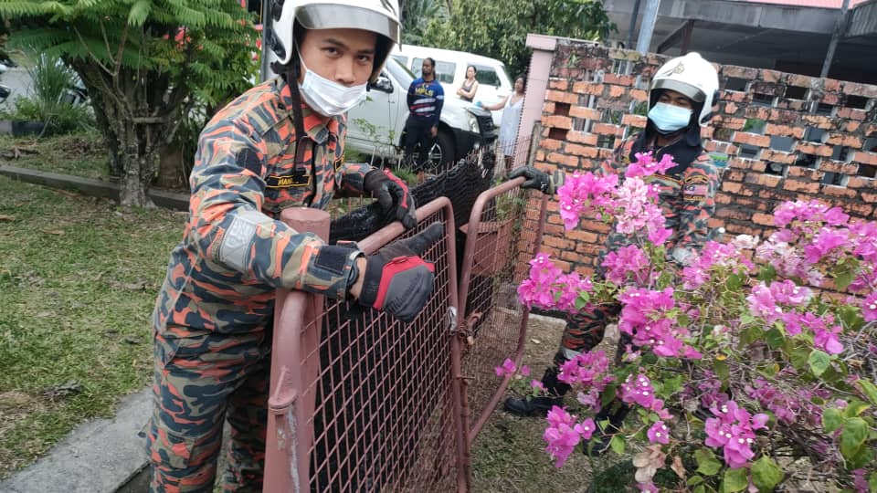 “Sebaik tiba di lokasi itu, pasukan bomba bertindak membuka pintu pagar terkunci menggunakan peralatan khas.