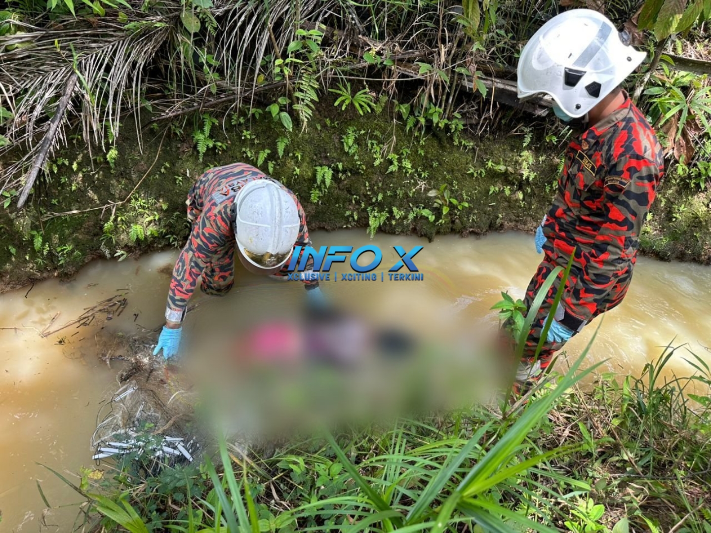Mayat dikenali sebagai Ria Tagunggu ditemui dalam keadaan tertiarap terapung di parit dipenuhi air.