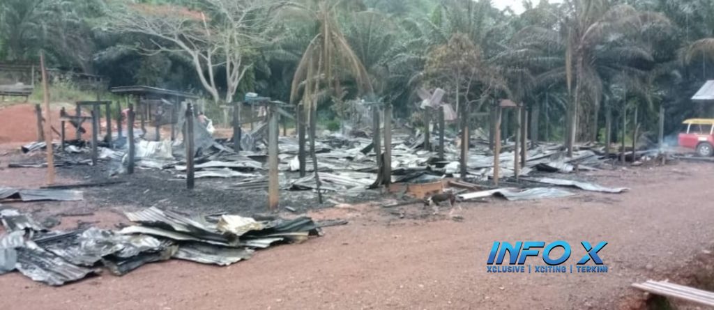 Rumah kongsi yang musnah terbakar di Ladang Brumas, Kalabakan, Tawau. – Foto Bomba