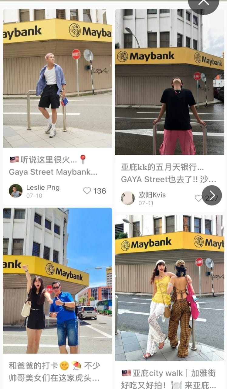 Bergambar di lokasi berlatar belakang lambang Maybank dengan warna kuning terang itu dan memuat naik ke aplikasi Xiaohongshu dipercayai menjadi ‘trend’ pelancong China yang datang ke bandar raya ini untuk menunjukkan bahawa mereka sudah sampai ke sini.