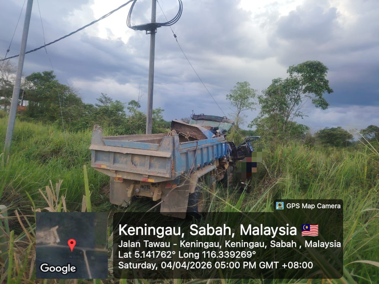 Lori 10 tan dipandu mangsa dipercayai hilang kawalan sebelum terbabas ke bahu jalan, menyebabkan mangsa tidak dapat keluar.
