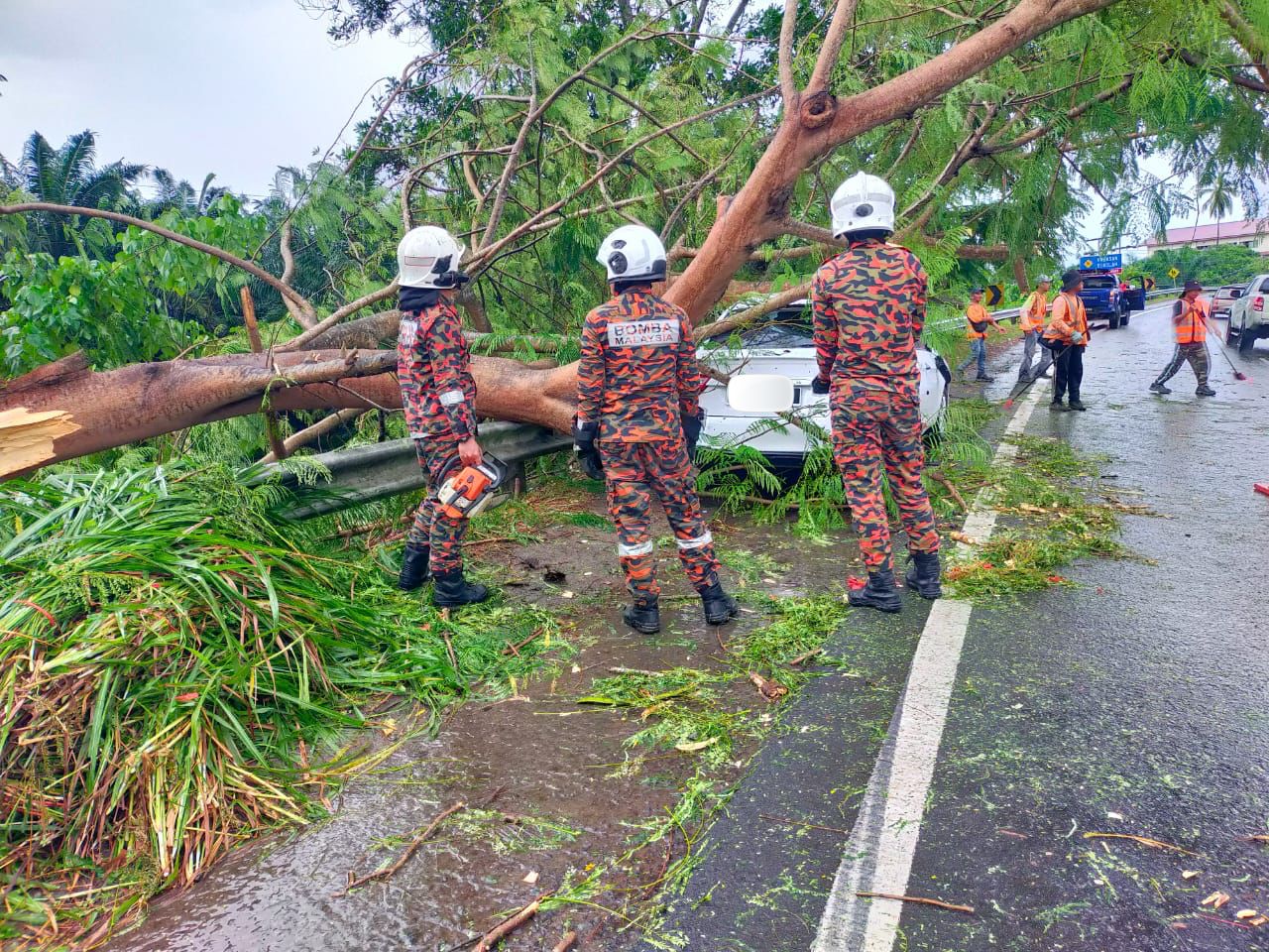 “Sebaik tiba, pasukan bomba mendapati terdapat sebuah kereta parkir di bahu jalan rosok di bahagian bumbung dan depan akibat dihempap pokok.