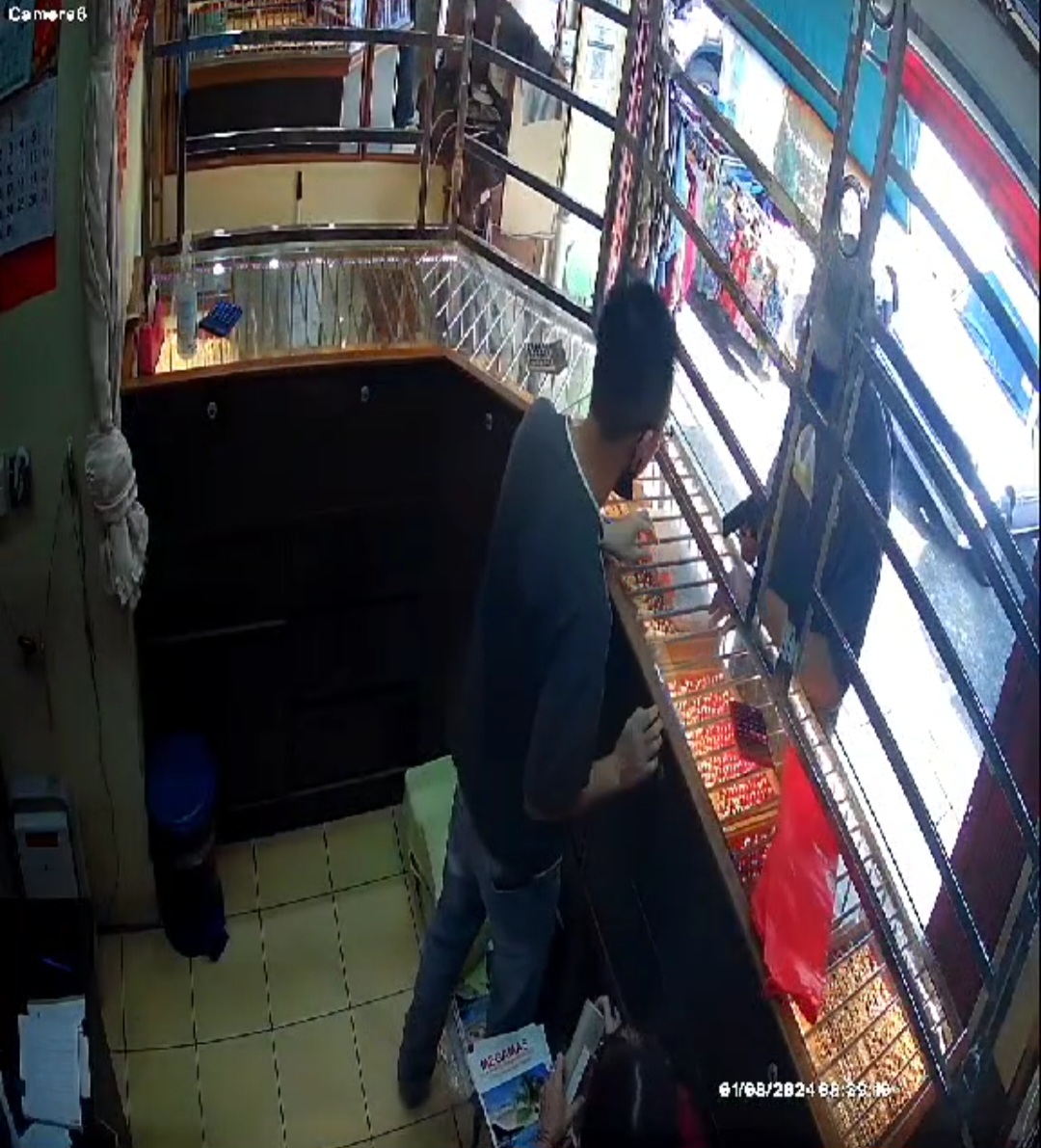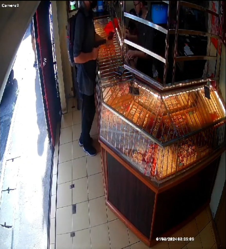 Dalam kejadian 8.39 pagi itu, pengurus kedai emas berkenaan yang sedang berkemas untuk memulakan perniagaannya didatangi seorang lelaki memakai topi dan pelitup muka.