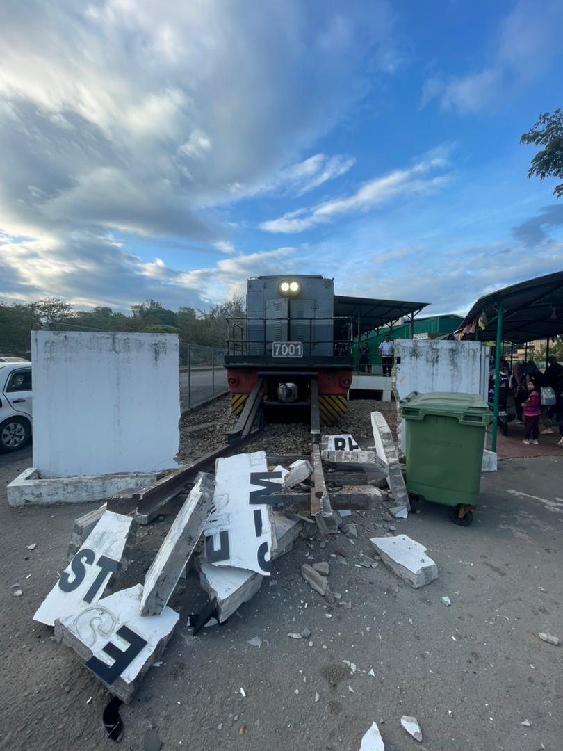 KOTA KINABALU: Penumpang dan kakitangan Jabatan Kereta Api Negeri Sabah bertugas berdepan detik cemas selepas sebuah lokomotif merempuh penghadang di hujung landasan dan dinding pagar Stesen Sembulan, di sini, pagi tadi.