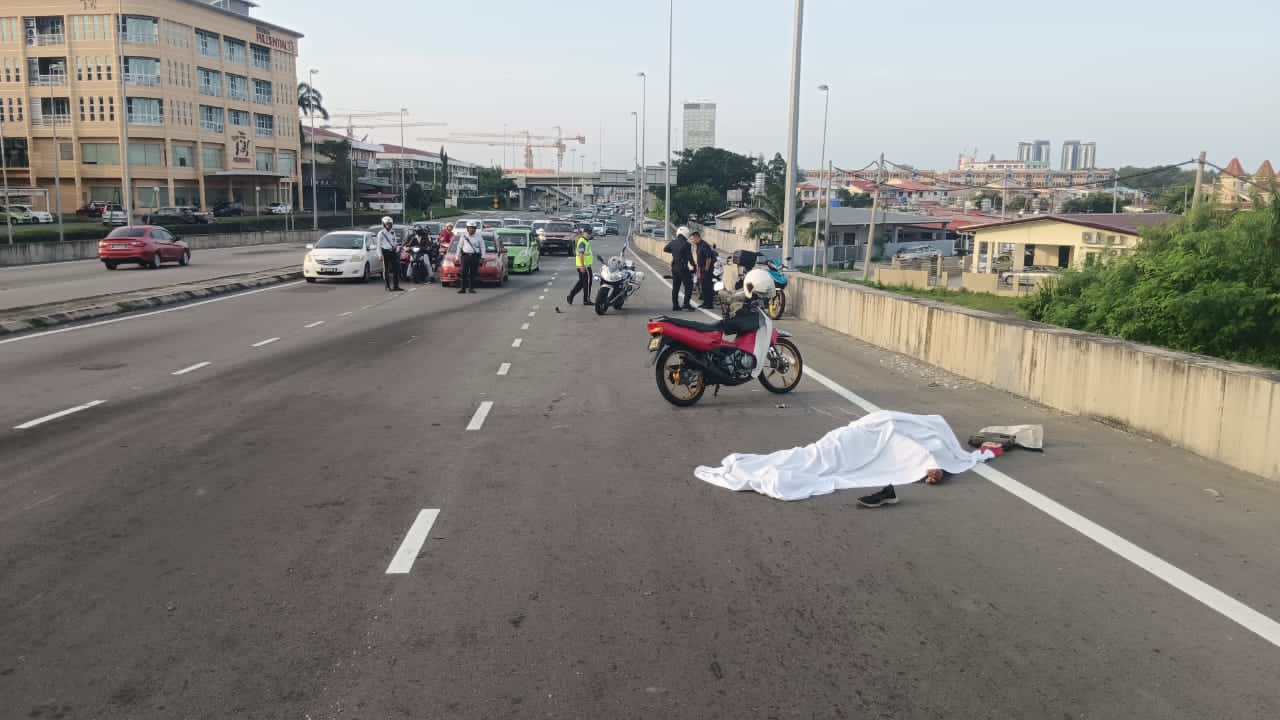 KOTA KINABALU: Seorang penunggang motosikal maut selepas dirempuh sebuah kenderaan di laluan bertingkat (flyover) Jalan Lintas berhampiran sebuah pusat beli belah, di sini, hari ini.