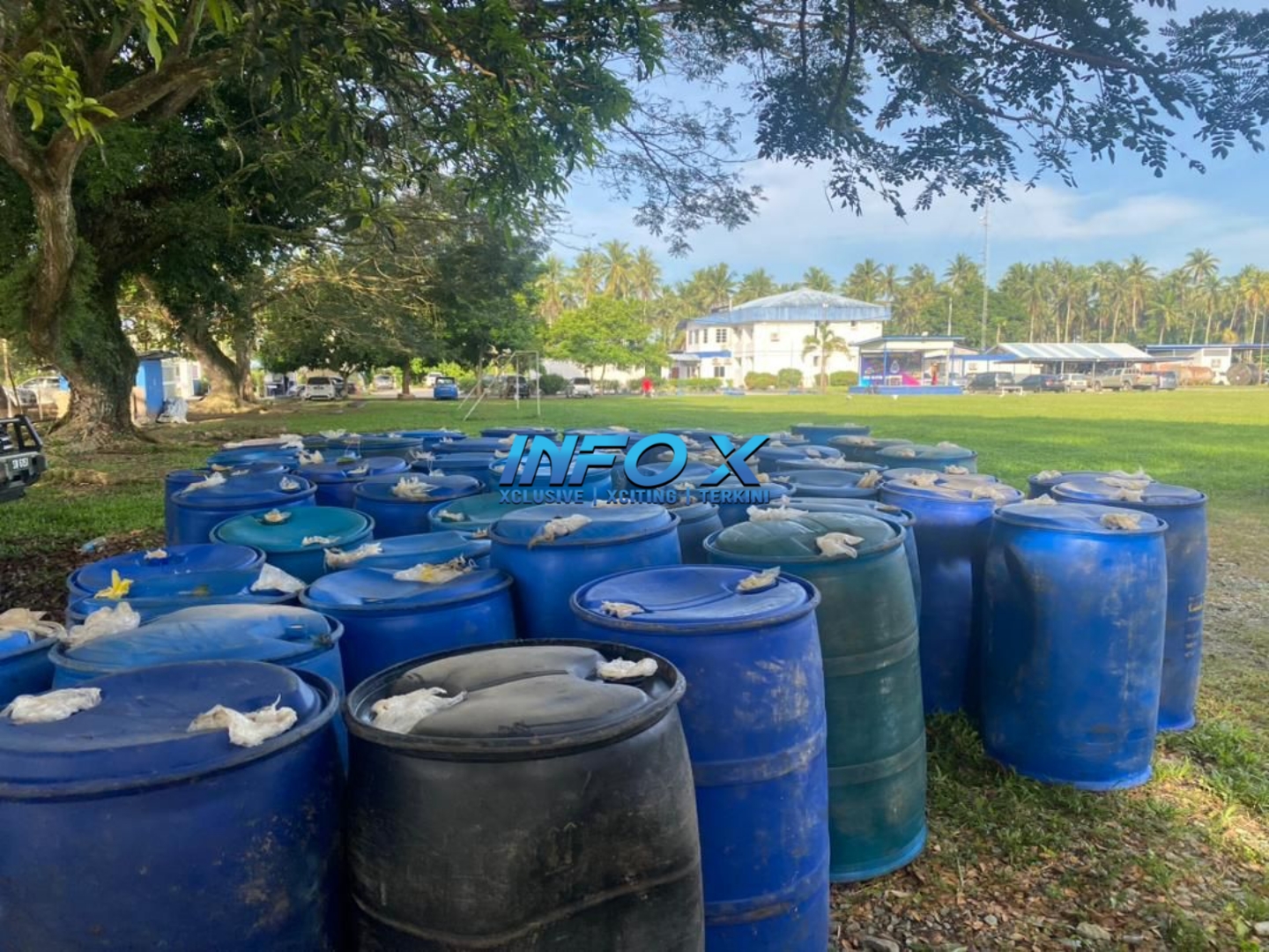 Tong dram berisi minyak petrol yang dirampas PPM dalam operasi di Pitas. – Foto/PPM