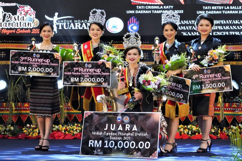 Manakala Unduk Ngadau dinobatkan kepada Tati Florina Wilah yang akan mewakili Tuaran ke peringkat negeri, kedua Tati Rannysa Rachel Lee mewakili Tamparuli dan ketiga Tati Melni Dhial (Kiulu).