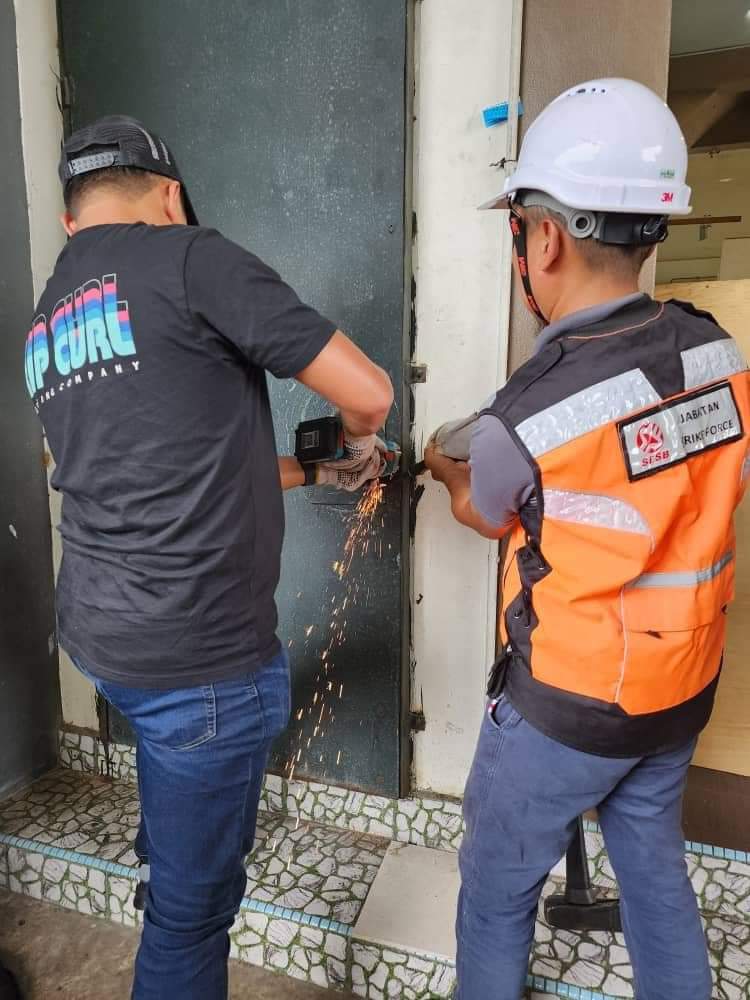 Kakitangan kerja SESB membuka pintu premis yang disyaki mencuri bekalan elektrik bagi perlombongan bitcoin. – Foto/SESB