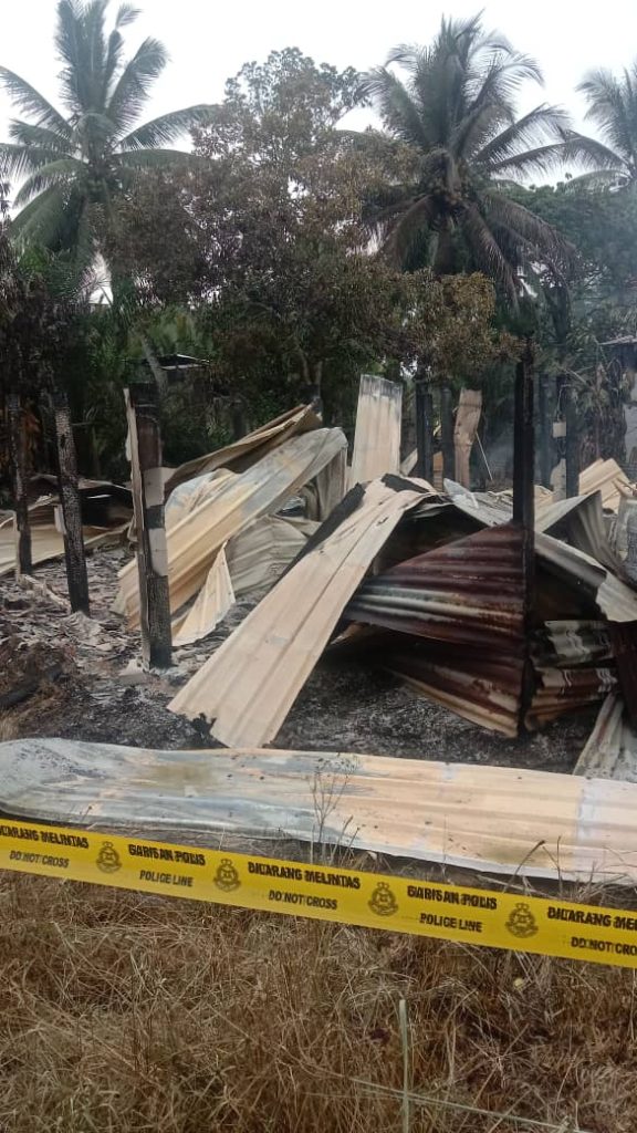 Rumah musnah dalam kebakaran di Kampung Sri Ganda, Kinabatangan. – Foto/Bomba