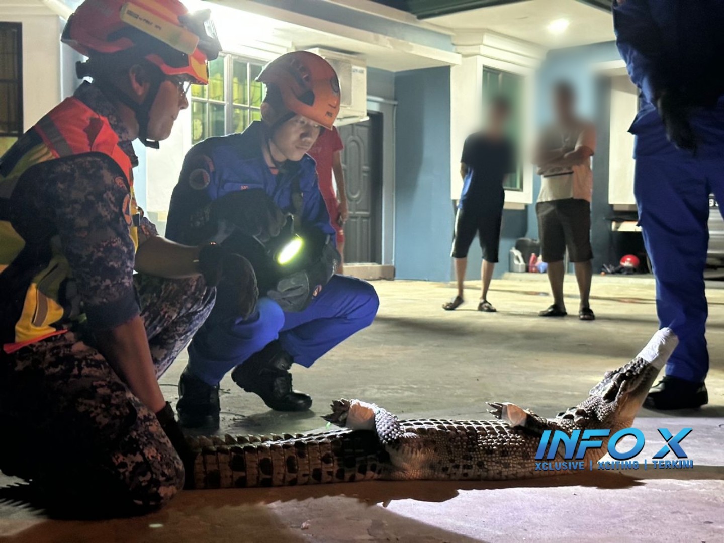 PUTATAN: Penghuni sebuah rumah di Kampung Ketiau, di sini, dikejutkan dengan kehadiran ‘tetamu tidak diundang’ seekor buaya sepanjang dua meter di depan rumah mereka, malam tadi.