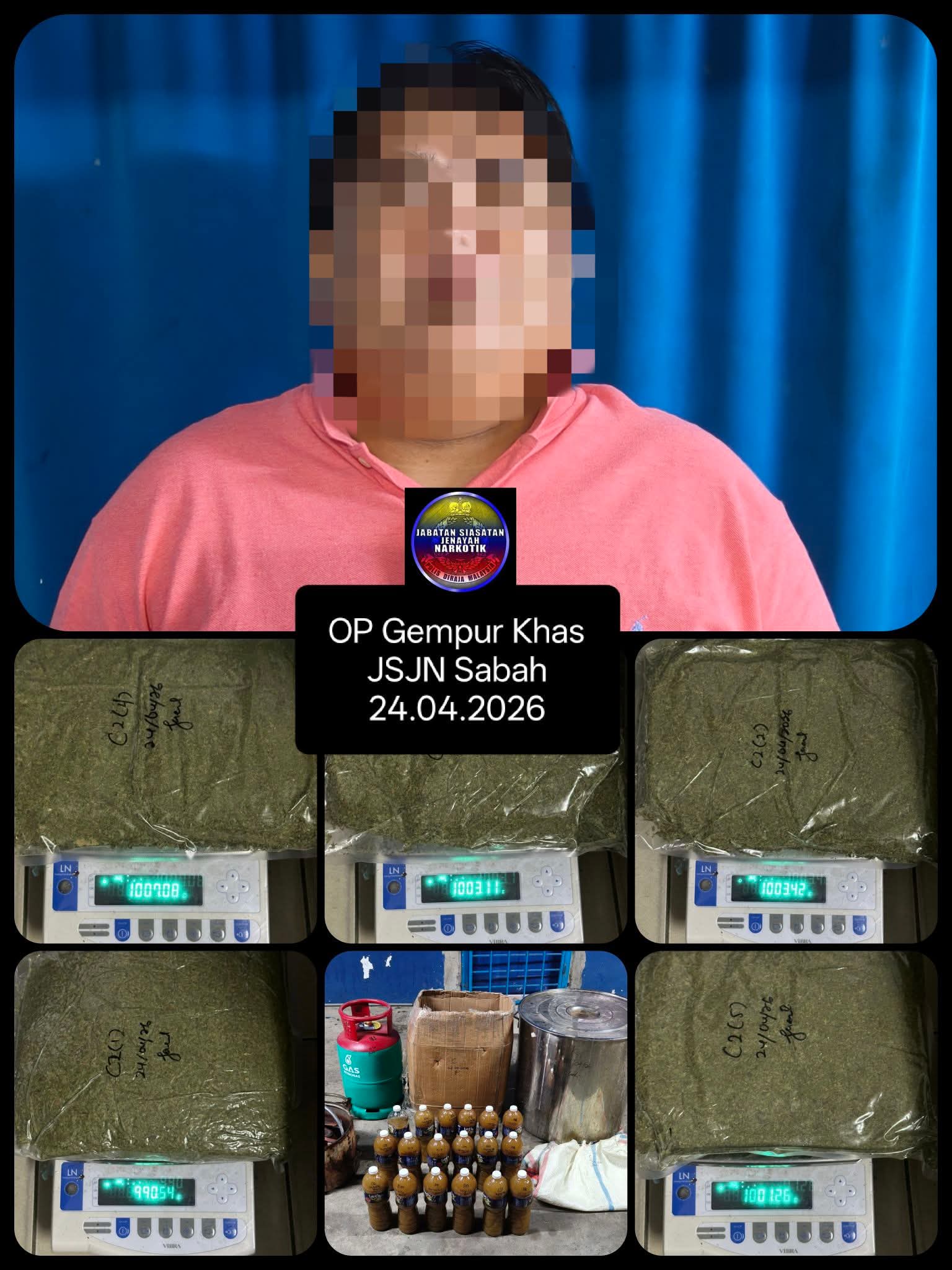 Dalam operasi ‘Ops Gempur Khas’ kira-kira jam 12.30 tengah malam, sepasukan Jabatan Siasatan Jenayah Narkotik (JSJN) Sabah menyerbu sebuah rumah tanpa nombor di Jalan Ramayah sebelum menahan lelaki tempatan berusia 41 tahun itu.