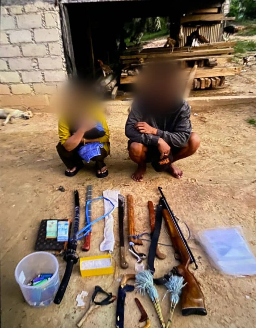 TAWAU: Suami isteri ditahan kerana memiliki senapang angin dan dadah jenis syabu dalam satu serbuan di Kampung Sungai Melayu, Pulau Sebatik, di sini, Ahad lalu.