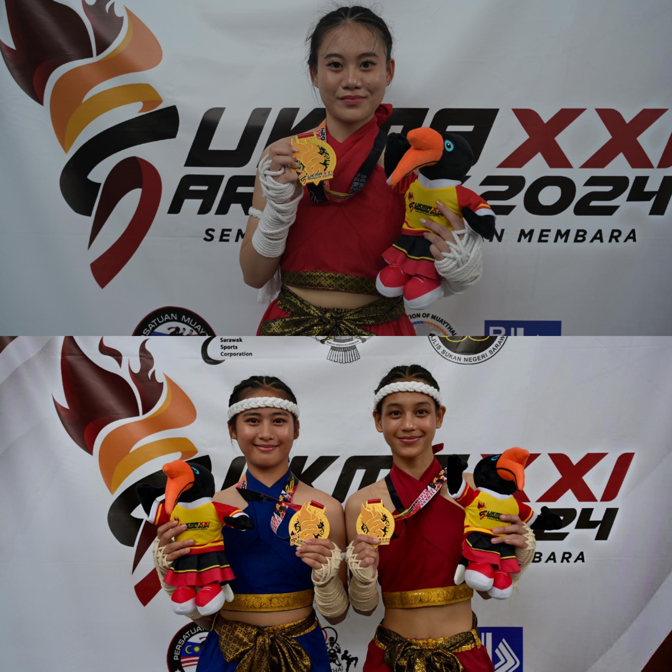 Pingat emas dimenangi gandingan Jezzevelle Myora Jerry dan Myra Roslan dalam acara seni duo mai muaythai wanita dan Yan Jia Chi dalam seni solo wai kru wanita.
