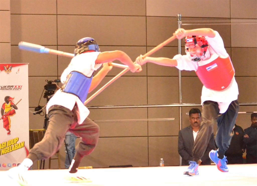 Aksi final Poruthal silambam 55-65kg lelaki antara atlet Sabah, Zeqxvaly (kanan) dan Prevenan (Perak) di Hikmah Exchange Event Centre, Kuching hari ini. Zeqxvaly tewas perlawanan itu 2-10.
