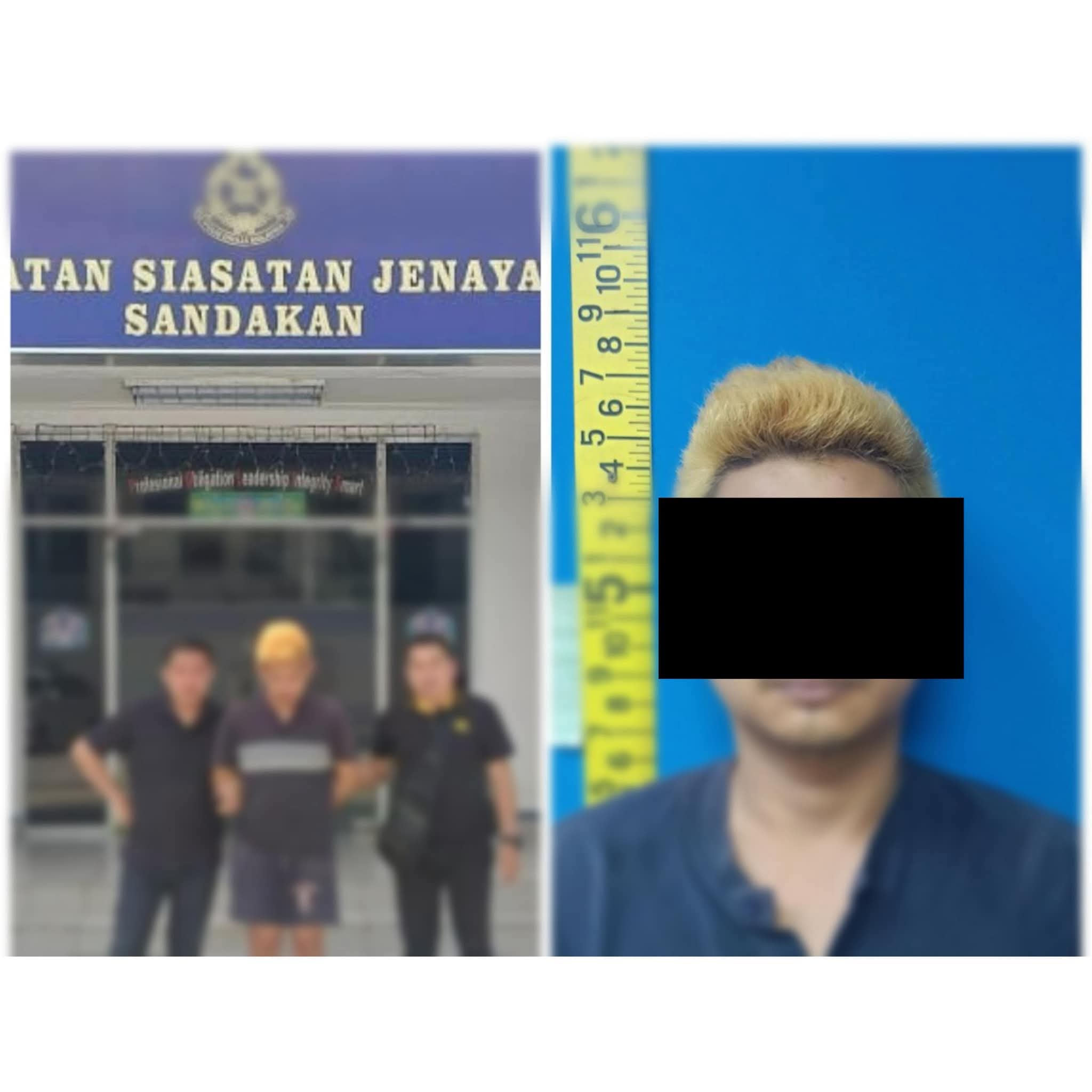 Suspek warga tempatan berusia 30 tahun ditahan oleh Bahagian Siasatan Jenayah Daerah (BSJD) Ibu Pejabat Polis Daerah (IPD) Lahad Datu dan Sandakan di perkarangan Balai Polis Sandakan.